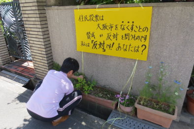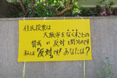 今度は、「住民投票は、大阪市をなくすことの 賛成か反対かを問うものです。私は、『反対』です!あなたは?」と書きました。通りに面して2枚の看板が並んでいます。さっそく「また新しいのをつけはってんな」と声が掛かります。自転車で通り過ぎる人の目が向けられます。わざわざ自転車を降りて、押しながら近づき話しかけてくれる人もいます。保育園のお散歩の幼児たちが指を差しながら興味深く見つめています。小学校や中学校の行き帰りに眺めて行く子ど...もたちもいます。知らない人から声が掛かり話が弾むこともあります。いつの間にか、結構楽しんでいる自分を発見しています。