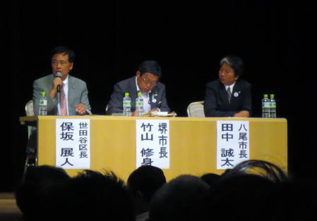 今度は南方面に移動して、街中で早い夕食を済ませて、第4弾の「住民投票緊急セミナー・特別区制度を考える」に参加しました。“府民のちから2015”が主催、自民党・民主党大阪府連が協賛して、大阪国際交流センター大ホールがぎっしり詰まる大集会となりました。東京世田谷区長の保坂展人さんを招いての講演と、堺市長と八尾市長を加えたパネルディスカッションが行われました。
