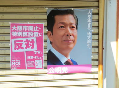 昨日(5月12日)、公明党の「プレミアムつき商品券を宣伝する山口代表」のポスターの上や、横に、「大阪市廃止・特別区設置に反対します」と書かれたポスターを見つけました。ついに公明党も「反対」する統一戦線に戻ってきた、と素直に嬉しく、また心強く感じたものでした。わが町・大阪市をなくしてはならない、橋下・維新の独裁を止めなければならないとの思いがつながり、怒りとも重なって、「オール大阪」の機運が盛り上がってきたように感じました。