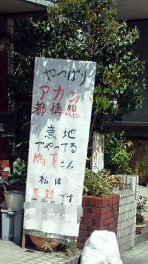 しかし誰かが悪意を込めて意図的にやったものではなく、強風にあおられてのものでした。思えば掲示してから10日余り、段ボールにマジックで書き、表面にビニール袋をかぶせただけの手作りの看板がよくもったものだと思います。当初落書きとか嫌がらせなども気に掛けてはいたのですが、なにせ気の小さいわが一家ですので、出勤途中の人たちや、保育所の送り迎えの途中で、散歩しながら、下校する小中学生や近所の保育園の園児たちのお散歩で、仕事帰りに…などら、家の前を行き交う人たちが、足早な人もあればのんびりと過ぎる人もあって、立ち止まりはしま...せんが視線を向けて通って行きます。けっこうみんなが見てくれているように思えます。近所の人や家に来た人たちと話すこともありました。
