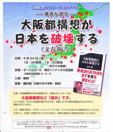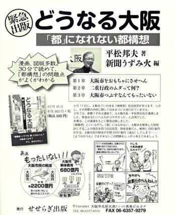 どうも大阪都構想をめぐる論議が高まっているとは思えません。というか、自由に論議を交わすことがやりにくい雰囲気を感じています。3月に市民の会主催の集会に参加したのですが、中之島中央公会堂の大ホールをほぼうずめる1000人近い参加者がありながら、都構想への批判や反対を言いきれず、予定していた講演者も「主催者に迷惑がかかることを配慮して」出席を自粛する…など、せっかく市民が声を上げて集まり、力を出し合い、苦労しながらたどりついたのであろう集会が、何か影の力に見張られおびえているかのような印象が私には残ってしまいました。