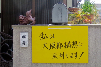 そこで、恥ずかしがり屋の私ではありますが、今自分の意見を表明したくなりました。妻に相談して看板を出すことに決め、いっしょに段ボールを切り、色ケント紙を両面テープで張って、その上に妻がマジックで勢いよく書いてくれました。「私は、大阪都構想に反対します!」と。気の弱い私は、通りかかる人の視線を気に掛けながら玄関の門柱に看板を括り付けたのですが、家に入ってからも近所の人たちはどう思うやろ?付き合いは変わらへんやろか?どんな顔して話したらええのか?…などとぐずぐずと考えてしまいます。権力の影におびえたくないと、ついさっき大見得を切ったところなのに、近所づきあいになるとこの有様です。情けない話です。