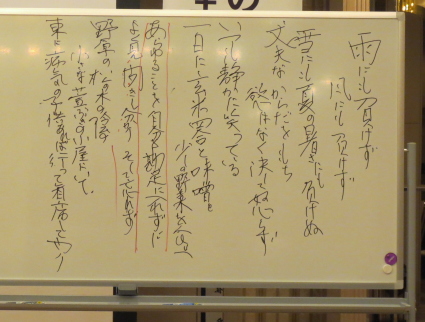2004年に脳出血で倒れ、そのリハビリ中に癌が発見されて再手術を受けたという辺見さんだが、「精一杯話をさせてもらう」と切り出されたとおり、6時30分から9時30分までの3時間話し続けられた。「潜思黙考」「境界を越える」「小指の先から一滴でもいい血を流しましょう」「自分という最小の単位で行動を起こす」「自分の言葉で表現する、文学の言葉でなくてよい」・・・等々のキーワードを駆使しながらの語りは、聞く者の心を揺さぶり、惹きつけずにはおかない圧倒的な力と魅惑に溢れていた。