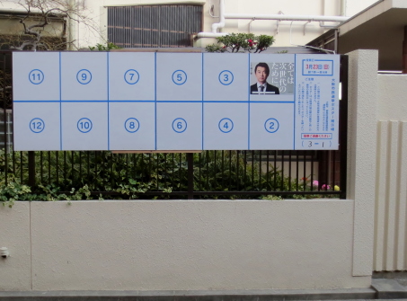 2枚目の看板に変えたとき、真向かいに建つワンルームマンションの外壁に突如「賛成」派のポスターが何枚も張られました。目を凝らすと、中の下足ホールや廊下にまで張られています。「あてつけか!」と一瞬気色ばんだのはこちらの勝手な思い込みでしょうが、集合住宅の住民には「反対」の人もいるだろうし、不快感を持たないのか、文句はでないのかと、強引なやり口に驚いてしまいました。