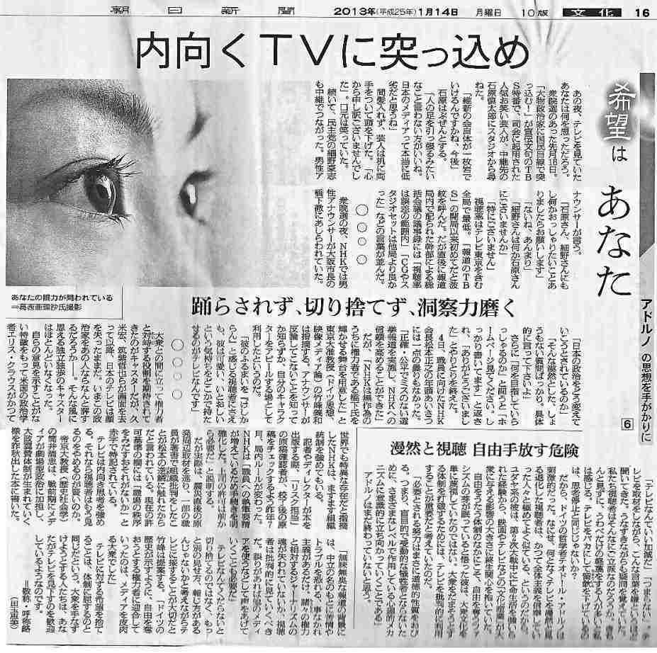 少なくともそれは次のような社会ではないはずです。法人税を引き下げ、社会保険料を引き上げ、社会保障を切り捨て、介護保険を改悪し、生活保護費を引き下げ、環太平洋連携協定(TPP)をすすめ、大企業の思惑通りに非正規雇用を増やし、貧者と弱者をどこまでもしいたげ、富者を喜ばせ、格差をますます拡大し、軍備を増強し、兵器を外国に輸出するような政権与党が国会の3分の2を超える議席を獲得し、さらに原発再稼働も、集団的自衛権行使の違憲立法も、労働者派遣法の改悪も、労働法制の規制緩和も特定秘密保護法も、選挙ですべて再信任を得たとして、このまま暴走を続けて行く(辺見..庸の言葉を借りました)ような、そんな時代と社会ではないはずです。