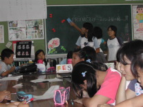 押し黙るように考え続けていた一人の6年生が前に進み出て、黒板に書き始めた。「FRIENDS・・・」みんなの目が注目する。「FRIENDSフェスタ、ほんで英語の上に読みがなをつけるんや」、ゆっくりとチョークが動く、(FRIENDSの上に「フレンズ」とルビがふられる)「これやったら低学年も読めるやろ」。一斉にため息が漏れるように、どの顔にも納得の表情が浮かぶ。「そこにこう付け加えたらどうやろ」、また一人黒板の前に立った。「FRIENDSフェスタ〜友だちになろう〜」、「どうや」と言わんばかりの笑顔をこぼして、「こう書いたら低学年も、だれでも意味もわかると思うねん」と付け加えた。