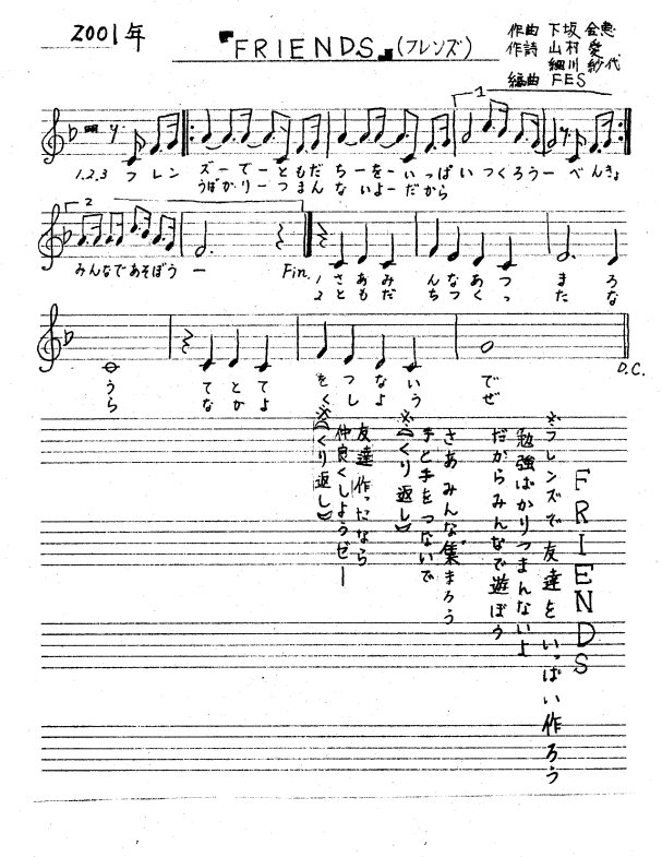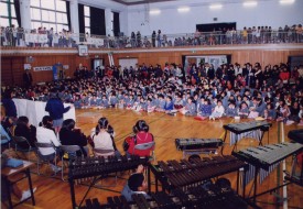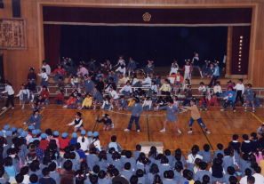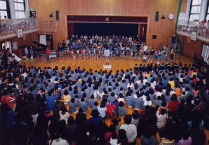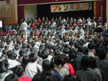 体育館の舞台上に居並ぶ、ドラムスを中心にしたクインテットとボーカルの8人のFESが『フレンズ』の演奏を始める。軽快なリズムに合わせて1年生から入場が始まる。次第に歌声が広がり、手拍子も生まれる。リズムに合わせて足踏みする子ども達もある。最後の一人が入場し終わるまで、曲は流れ続け、歌い継がれていった。高だか4・5日の、しかも子ども達だけの練習しかなかった歌だけれど、これまでに聞いたどの全校合唱よりも、元気いっぱいの歌声が体育館に響いていた、どの顔にもこぼれんばかりの楽しさが溢れていた。