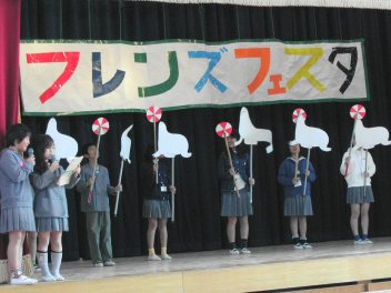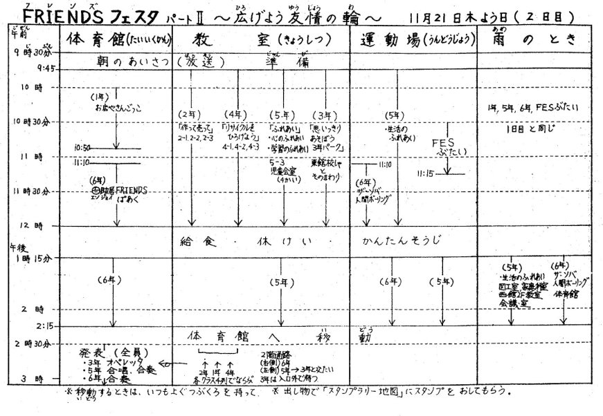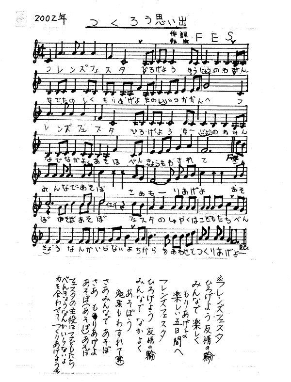 翌日には、『フレンズ』と題した曲を印刷して全校生に配り、音楽集会を開いて指導する。給食時間にも「みなさん、もう覚えましたか。フェスタで、みんなで大きな声で歌いたいと思います」と校内放送で呼びかけながら、何度も繰り返し歌っていた。