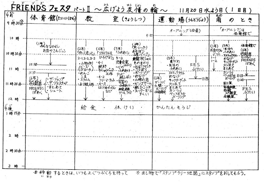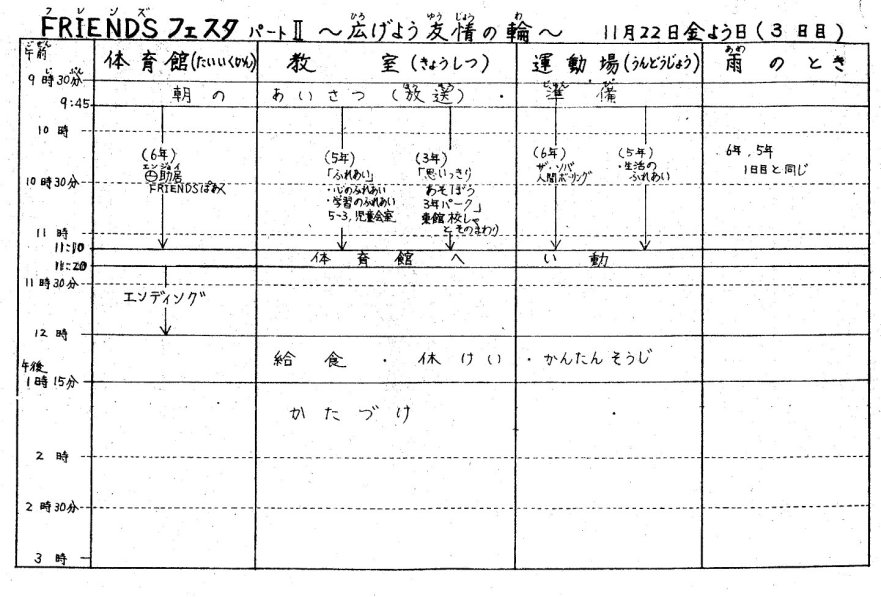 翌年、新しい児童会役員に選出された人たちは、4月に就任するやさっそく11月の“FRIENDSフェスタ”に向けた取り組みを開始した。最初の活動は、全校生と教職員に対するアンケートであった。中でもフェスタの日時に関する項目は、教師達の目を釘付けにした。「あなたは今年のFRIENDSフェスタの日数は、次のどれがいいと思いますか。@去年と同じ2日間、A1週間、B1ヶ月、Cそれ以外」と書かれてあった。
