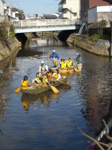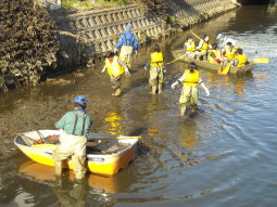 川そうじのグループは胴長の防具を着込んでボートに乗り込み、川に入って掃除したりと、子ども達は大活躍だった。下水道課の人たちや、水辺クラブの人たちが集まってくださり、ボートの準備や安全確保、付き添い等々、気配りと応援をしてくださった。たくさんの人たちのお世話になった。「手伝えることはないですか」「応援してますよ」・・・と地域から声も届く。子ども達の学習に取り組む姿が、地域の関心を呼び、校区の人たちの反応が伝わってくる。「わが町の古川」を通して、子ども達と地域が一緒になって何か取り組みが生まれるのではと、そんな楽しみを感じてしまう。