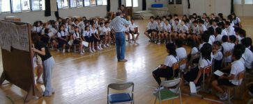 そこで、今日みなさんが帰るときに体育館の前でコイの卵を水槽に入れて見られるようにしておきます。詳しいおじさんもそばに付いて下さっています。ぜひ帰りに見て帰ってください。