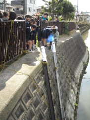 下水道課や水辺クラブの人たち、うわさを聞いた保護者たちなど、お世話になった方たちも大勢集まって見守る中、子ども達がペアーで持ったバケツに数匹ずつのコイを入れ、慎重に慎重にバケツを傾けて、1匹、また1匹と、まるで声をかけるかのように、川の中に戻っていく姿を確かめながら、放流していった。