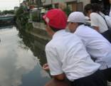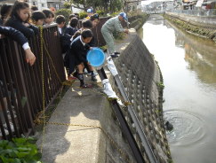 3月12日、いよいよ1年間かけて育ててきたコイを生まれ故郷の古川に還す日がやって来た。古川の大掃除も終え、これから古川をきれいにして欲しいという願いも込めて、ポスターを張り、手作りのゴミ箱も設置し、4袋の浄化装置まで川の中に沈ませて、子ども達なりに考えられる万全の準備をして迎えた日であった。