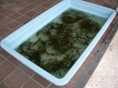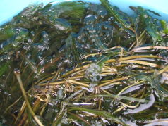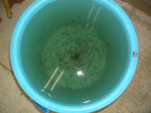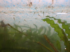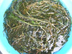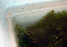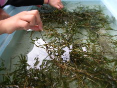 ランドセルを背負ったまま興味津々の目で水槽を覗き込む子ども達の群がりは、ひきもきらず続いた。「コイの卵ってどれ?」「見えた見えた、ほらあの透明の小さな丸いヤツやろ」「水草にいっぱい付いてるやん。全部で何個くらいあるのんかな」・・・。2時過ぎから4時半まで、延々と子ども達の漏らす呟きや質問の一つ一つに、終始笑顔をこぼしながら水辺クラブの加藤さんはていねいに付き合ってくださっていた。