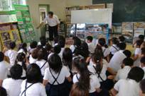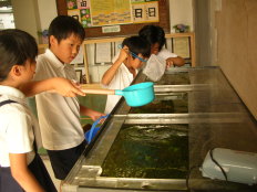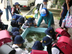 この話を聞きつけた市の下水道課から連絡が入った。「春に古川を上ってきた鯉が産卵した卵をかえして育てているのだが、4年生の子どもたちが育ててくれないだろうか」と言うのだ。子どもたちが反対するわけがない。4年生みんなで育てようということになった。さっそく下水道課のおじさんに来てもらって話を聞く。水辺クラブの方が60匹程の鯉を入れた大きな水槽を持って来て下さった。![]()