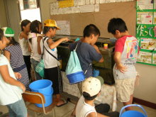 夏休みの間も、子ども達は毎日コイのえさやりと水替え、そうじを続けた。もちろん観察カードも書き続けた。