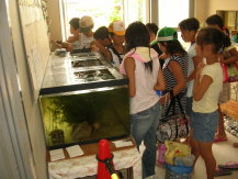 下校途中の子ども達が次から次へと水槽の周りに集まり、覗いて行く。加藤さんは延々と続く一人ひとりの話に耳を傾け、応えてくださる。