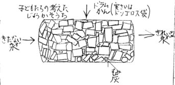 子ども達の考えた浄水装置。実際はドンゴロスの袋に変更された。