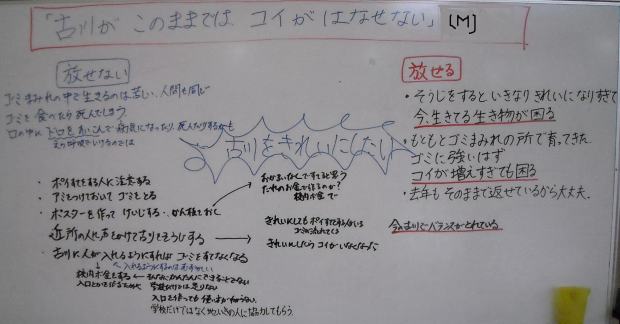 その中で、M君が「こんなに古川が汚れていたら、ぼくらの育てたコイは放せない」と発言した。次回はM君の意見について話し合うことになった。