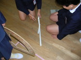 では、1平方メートルの正方形の上に、いったい何人乗れるだろう?と問題を出し、予想を立てた後で、新聞紙で実際作って実験してみることにした。