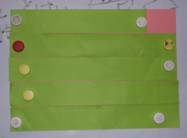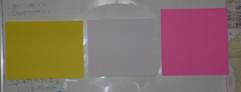 「では、これだったら比べられる かな?」と、3色の長方形と正方形を黒板に張る。縮小した同色の3つの形を一人一人に配り、「班で相談しながら、『広さ』の大きい順番を見つけよう。折っても、切っても、線を引いてもいいよ、いろんな工夫をして順番を見つけてごらん。」と言った。@とBの比べ方に様々な工夫が生まれてくる。1つの方法を見つけた者が、班の者に説明している。