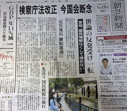 5月18日の夕刊で「検察庁法改正案 今国会見送り浮上」の見出しを見て、その夜のニュースで「今国会断念」の報道を知ったとき、久しぶりに喉の奥に詰まっていた異物がとれたような爽快感を感じました。 700万件を超える(現在までにいったいどれだけの数に上っているのでしょうか)「#検察庁法改正案に抗議します」のSNS上の「抗議の意思」が発信され、検察OBたちが法務省に「反対」の意見書を提出し、メディアの発表した内閣支持率が10ポイント近くも下がり、「支持しない」が大きく逆転、それらが一挙にうねりとなって、安倍政権、自民党、公明党を動かしたことはまちがいありません。